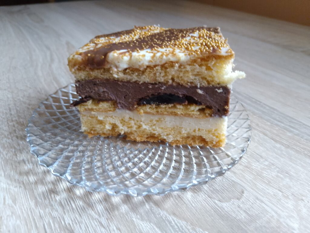 My version is made with a fluffy sponge cake from 7 eggs, homemade almond-flavored custard cream divided into two parts: one vanilla and one cocoa. In the middle, you will find Delicje (Polish soft biscuits with fruit jelly and chocolate), which add a fruity surprise. On top, I spread a creamy white chocolate and mascarpone glaze, decorated with sprinkles – it looks just like a patisserie dessert ✨.